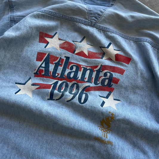 Vintage 90s Atlanta 1996 Olympics denim button up shirt very cool denim embroidery on front and big back graphic Light blue denim